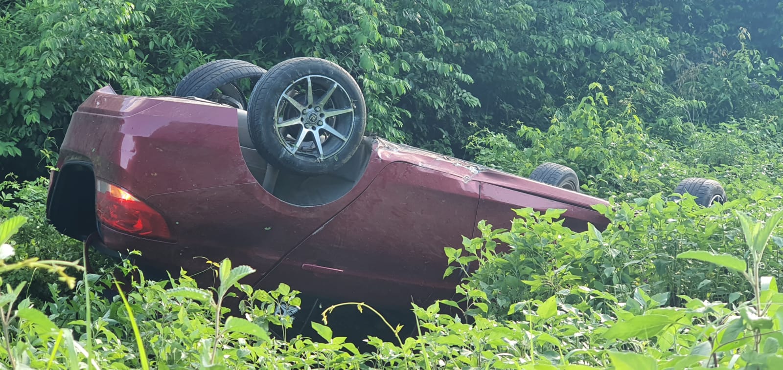 Tulum.- La mañana de este miércoles pasado un vehículo terminó volcado entre la maleza a la orilla de la carretera Tulum-Cobá, al explotarle un neumático.