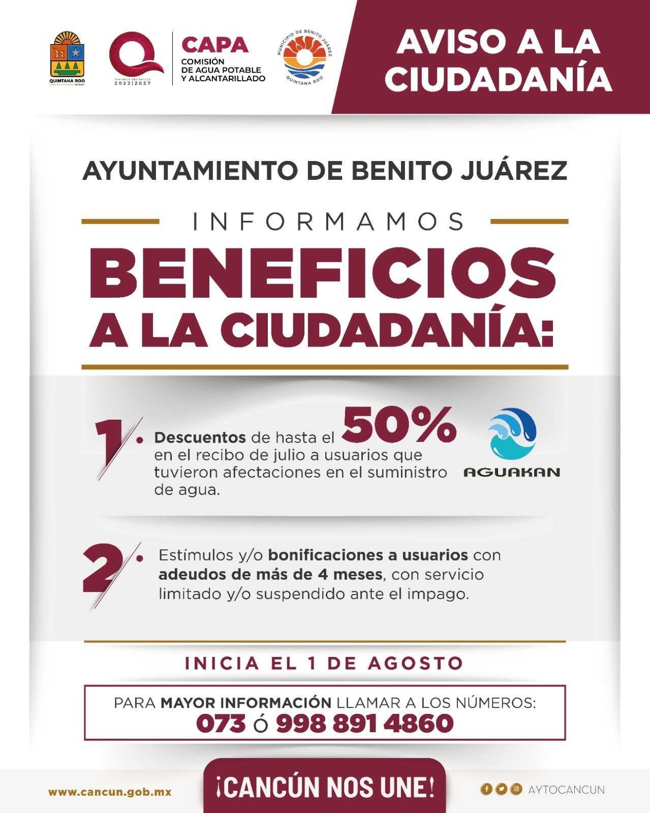 A exigencia de la Presidenta Municipal Ana Paty Peralta y del Ayuntamiento de Benito Juárez, la empresa concesionaria de agua potable Aguakan se comprometió a implementar un nuevo programa “Compromiso compartido”, a partir del 1 de agosto próximo, que incluye descuentos de hasta el 50% a usuarios que tuvieron afectaciones en la dotación del suministro de agua, así como facilidades para brindar estímulos y/o bonificaciones a usuarios con adeudos de más de 4 meses, con servicio limitado y/o suspendido ante el impago.