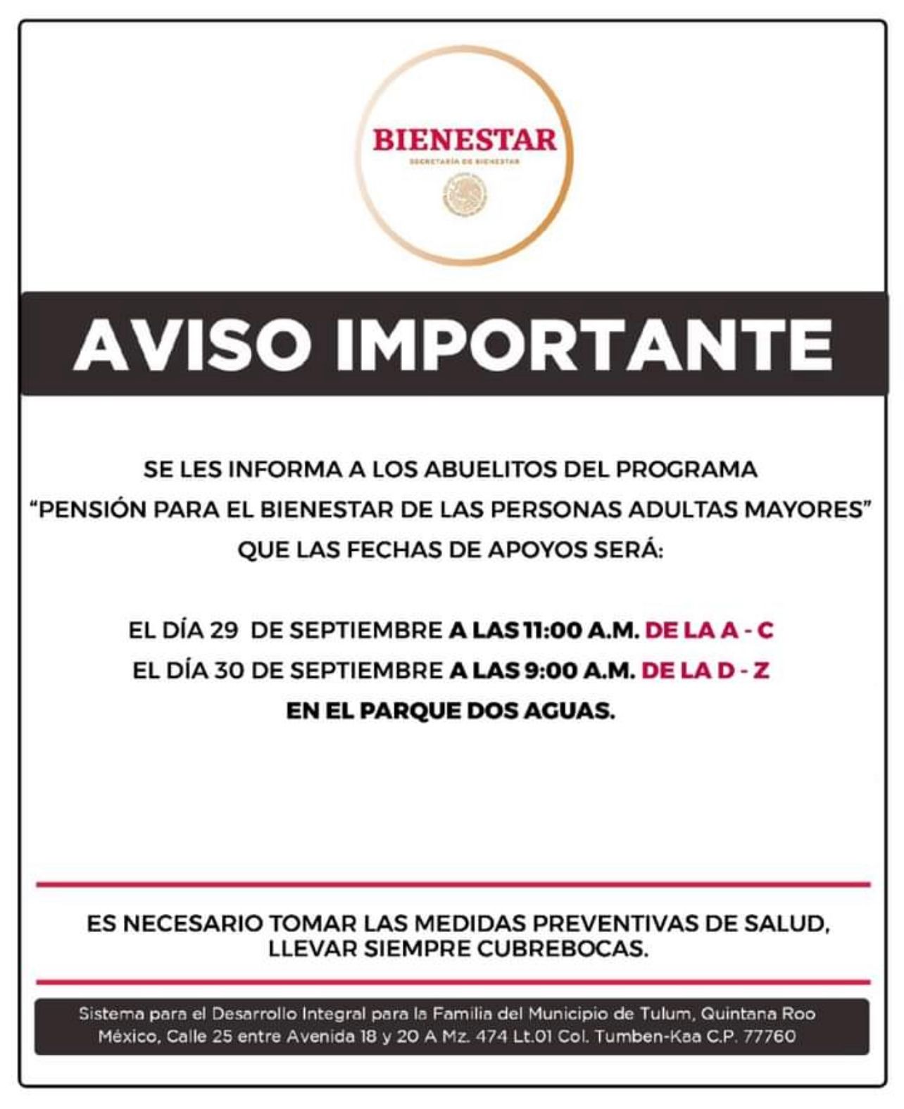 TULUM. La Secretaría de Bienestar, anunció que los próximos días 29 y 30 de septiembre , los abuelitos podrán acudir por los apoyos del programa “Pensión del Bienestar de las personas adultas mayores” la entrega se realizará en el parque dos aguas.