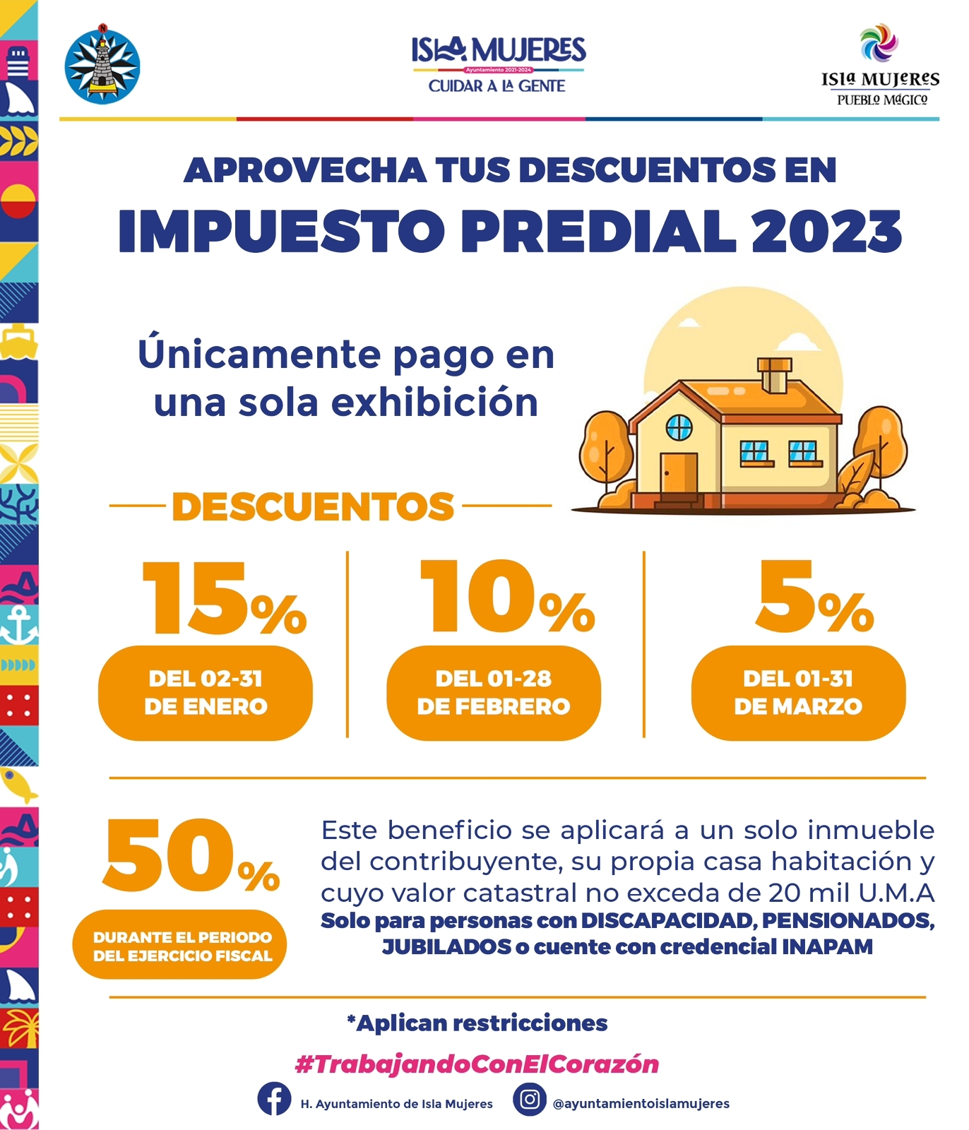 Las personas discapacitadas, pensionadas, jubiladas, o que cuenten con credencial de INAPAM o INSEN, tendrán un descuento del 50 por ciento, durante todo el ejercicio fiscal 2023, realizando el pago en una sola emisión y comprobando que sean propietarios del domicilio y cuyo valor catastral no exceda a 20 mil U.M.A. (Unidad de Medida y Actualización), este beneficio se aplicará a un solo inmueble del contribuyente; mientras que en lo que se refiere al servicio de la Recolección de Basura tanto en viviendas como en comercios, se otorgará un diez por ciento de descuento.