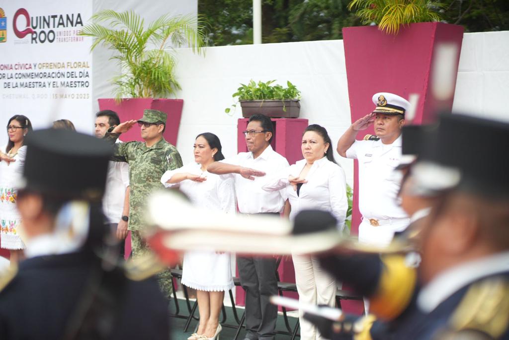 Chetumal.- Esta mañana, con una ceremonia cívica y una ofrenda floral en el Parque al Maestro de Chetumal, arrancaron las actividades para celebrar a los maestros en su día, en todo el estado, mismas que se prolongarán hasta la semana próxima.
