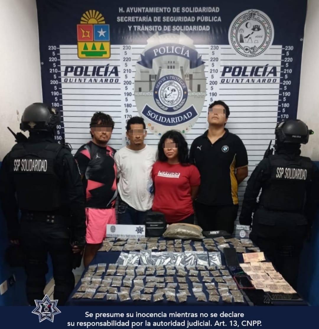 Playa del Carmen, Solidaridad a 30 de mayo de 2022.- Cuatro sujetos, tres hombres y una mujer, fueron asegurados por policías de la Secretaría de Seguridad Pública y Tránsito Municipal de Solidaridad, con más de 150 bolsitas, un paquete y cigarrillos de la posible droga conocida como marihuana, la noche del domingo 29 de mayo.
