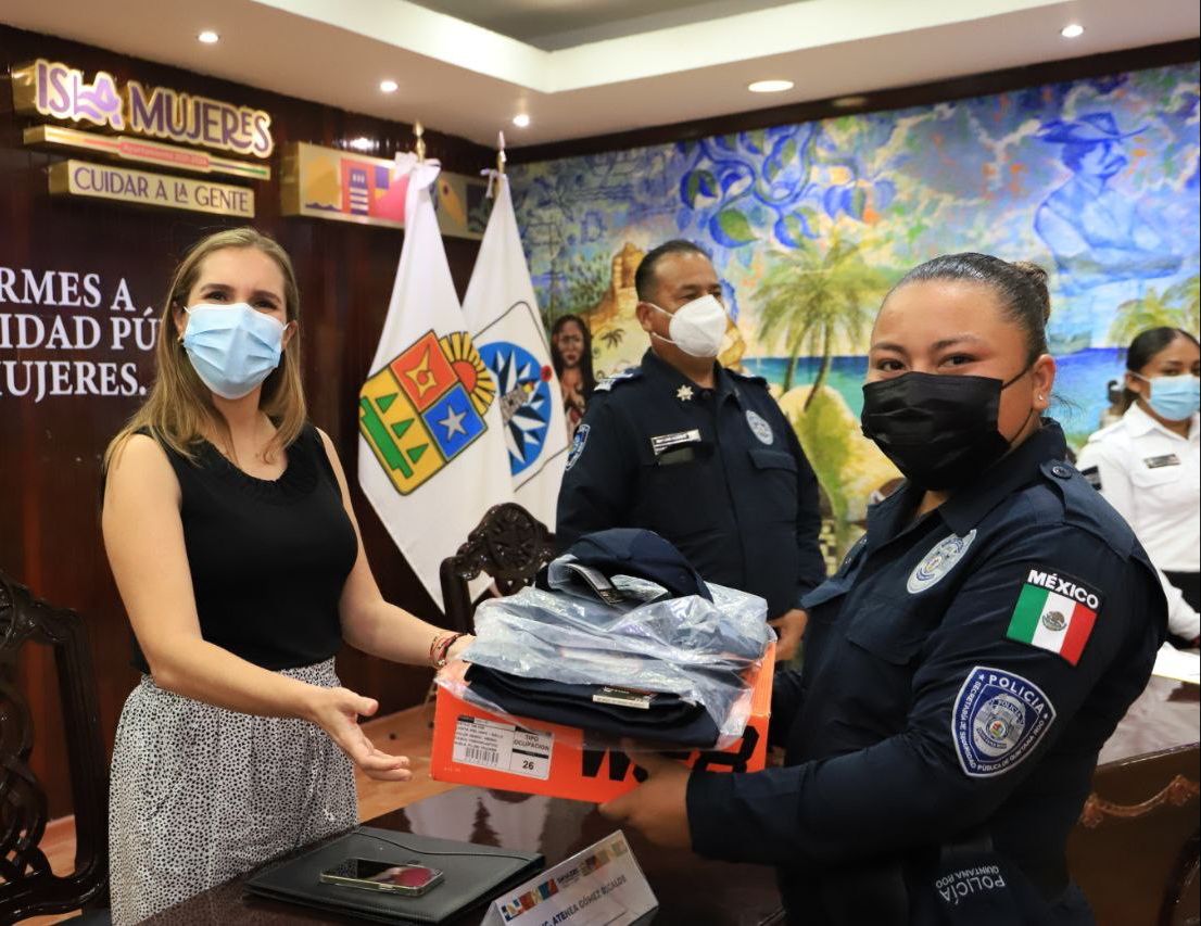 ISLA MUJERES. Con la finalidad de mejorar y dignificar las condiciones laborales de quienes brindan seguridad a las familias isleñas, la presidente municipal, Atenea Gómez Ricalde, entregó uniformes nuevos a los elementos de la Dirección General de Seguridad Pública y Tránsito Municipal.