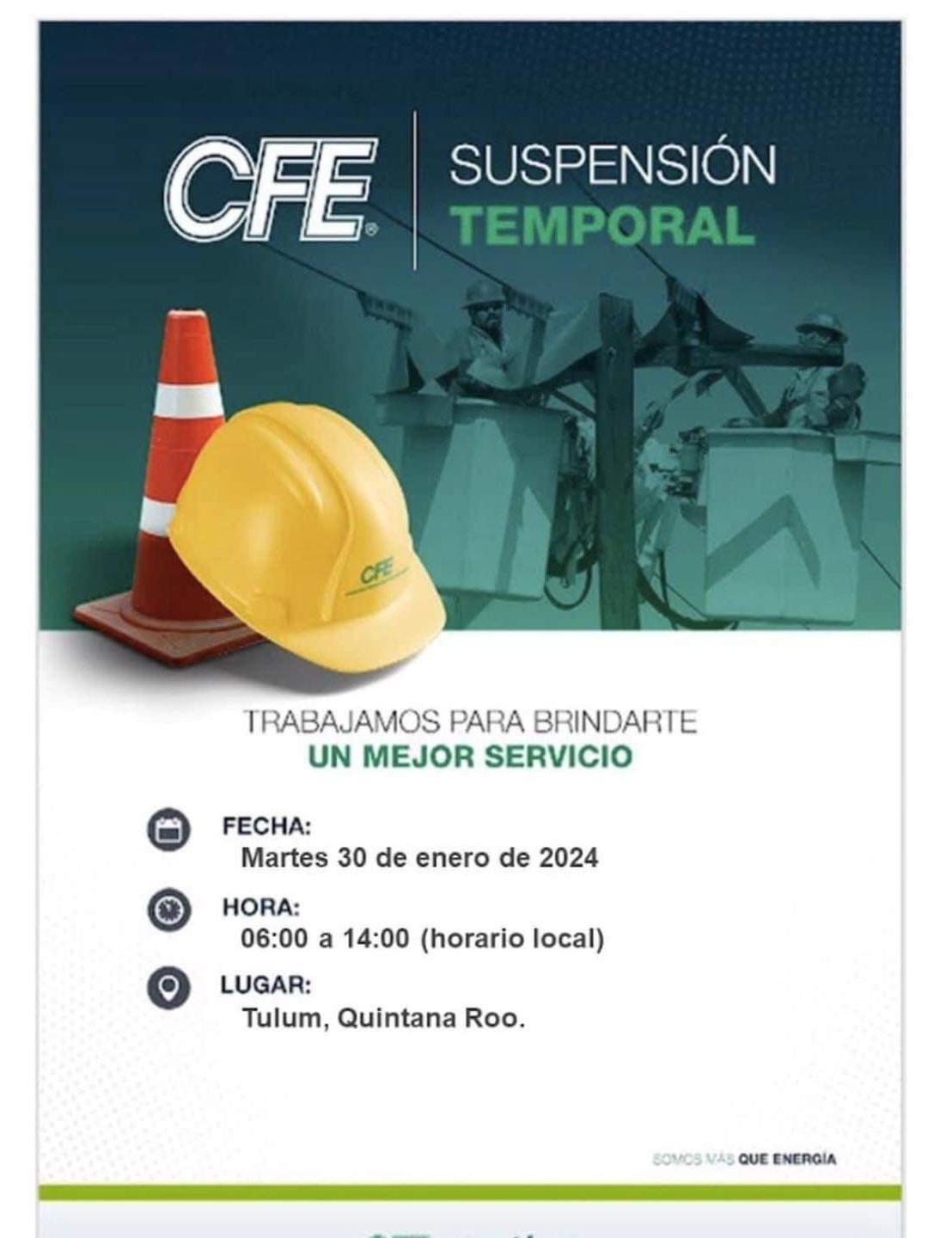 TULUM.- La Comisión Federal de Electricidad (CFE) informó sobre un suspensión temporal del servicio eléctrico para los habitantes de Tulum, que durará un total de 8 horas, el próximo martes, 30 de enero.