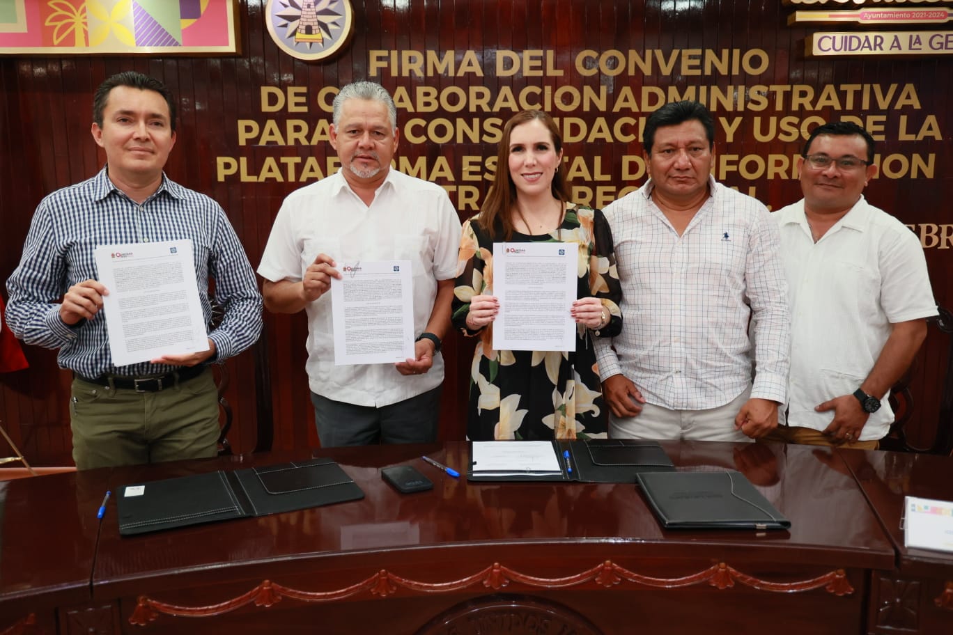 Isla Mujeres, Quintana Roo.- Con el firme propósito de garantizar la certeza jurídica en el patrimonio de las y los isleños para generar un desarrollo sustentable y ordenado en el municipio, la presidenta municipal de Isla Mujeres, Atenea Gómez Ricalde refrendó la firma del convenio de colaboración administrativa para la consolidación y uso de la plataforma estatal de información catastral y registral en la Sala de Cabildo del H. Ayuntamiento de Isla Mujeres.
