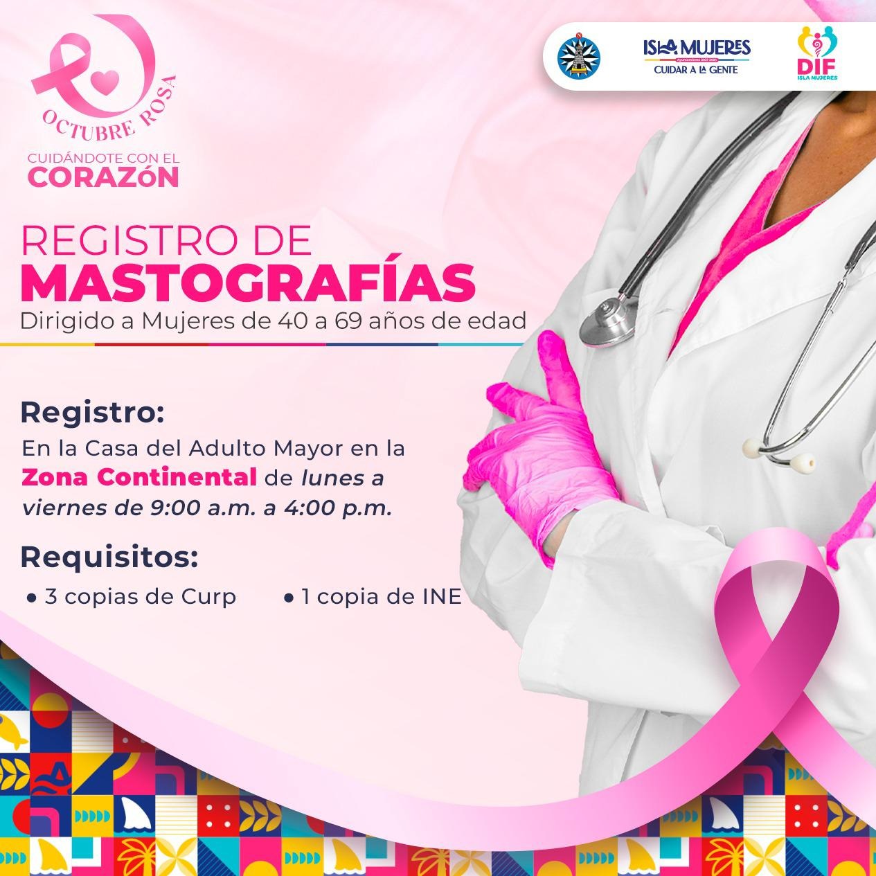 Al respecto, la directora de Salud de Isla Mujeres, Teresa Gómez Herrera, explicó que del 1 al 31 de octubre se realizarán mastografías en la Uneme-Dedicam de Cancún con previo registro, por lo que invitó a las mujeres isleñas a registrarse. Este estudio debe efectuarse cada año para detectar a tiempo el cáncer de mama e iniciar de inmediato el tratamiento adecuado.