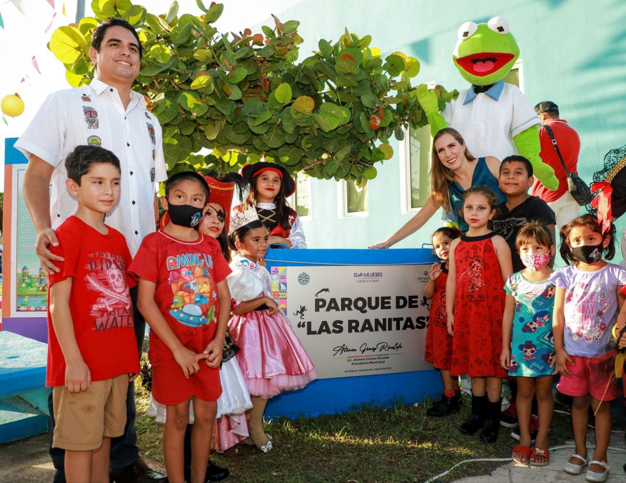 Isla Mujeres, Quintana Roo.- Las niñas y los niños de la zona insular de Isla Mujeres cuentan con un nuevo espacio para su entretenimiento luego de que la presidenta municipal, Atenea Gómez Ricalde, inauguró el parque infantil “Las Ranitas” en la colonia “La Gloria”.