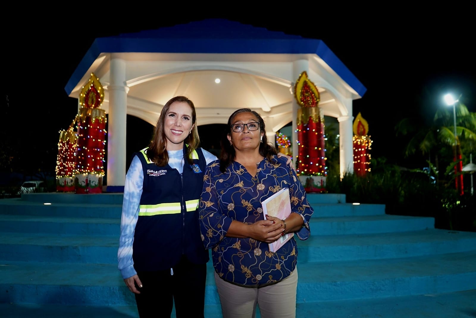 Además, se incluyeron cuatro postes nuevos, 24 reflectores de piso y un quiosco mejorado y más iluminado; todo esto en una extensión de 272 metros cuadrados, incluyendo el estacionamiento, como parte de los trabajos se rehabilitó la Caseta de Policía para que las familias isleñas acudan con la tranquilidad de estar en un lugar seguro.