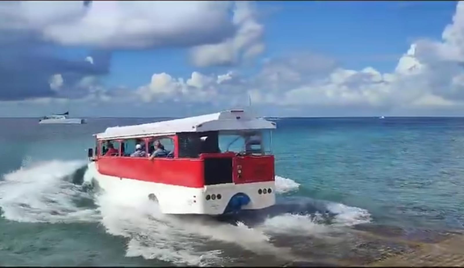 A través de redes sociales, distintos videos han circulado en los cuales muestran a este camión transitando por distintas avenidas céntricas de Cozumel, para luego introducirse en el mar, con pasajeros a bordo.