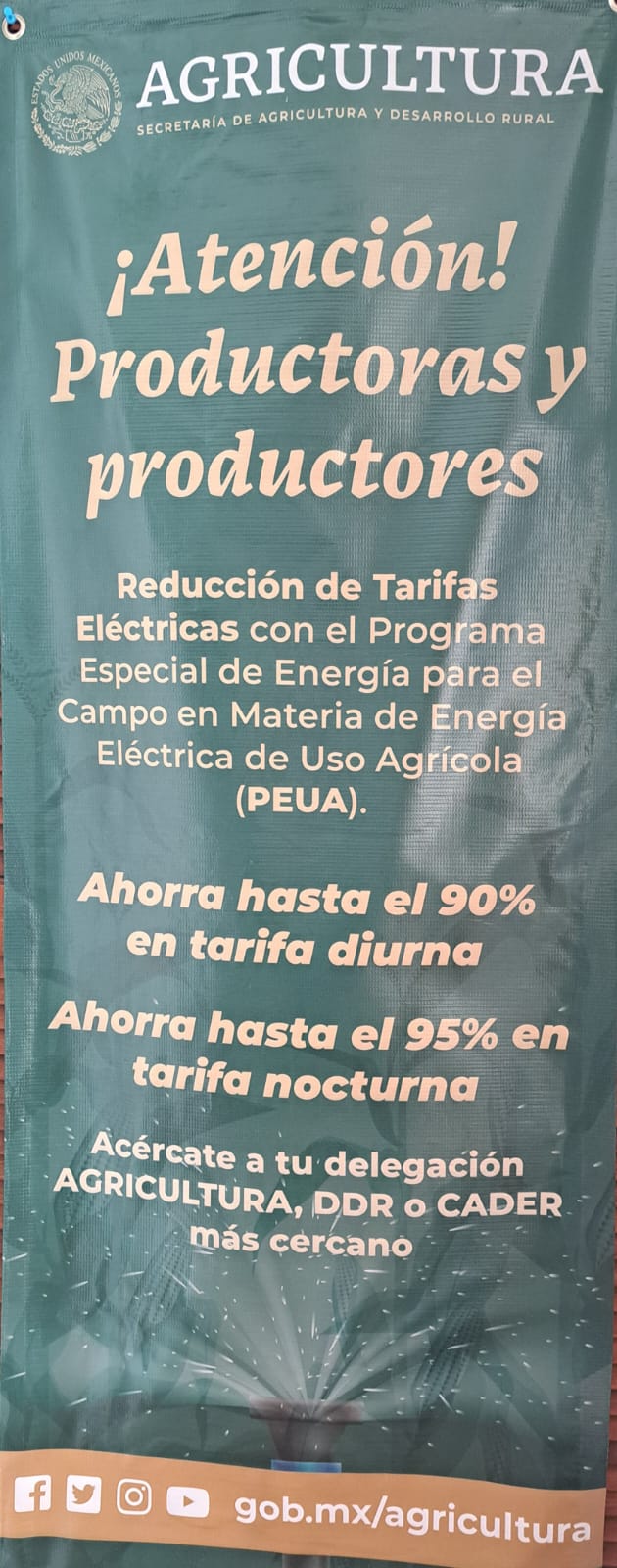 La Secretaria de Agricultura y Desarrollo Rural, presentó un programa especial de energía eléctrica de usos de riego agrícola, que consiste en un apoyo del 90 por ciento de subsidio sobre el costo del consumo de energía y se aplica para el bombeo y rebombeo.