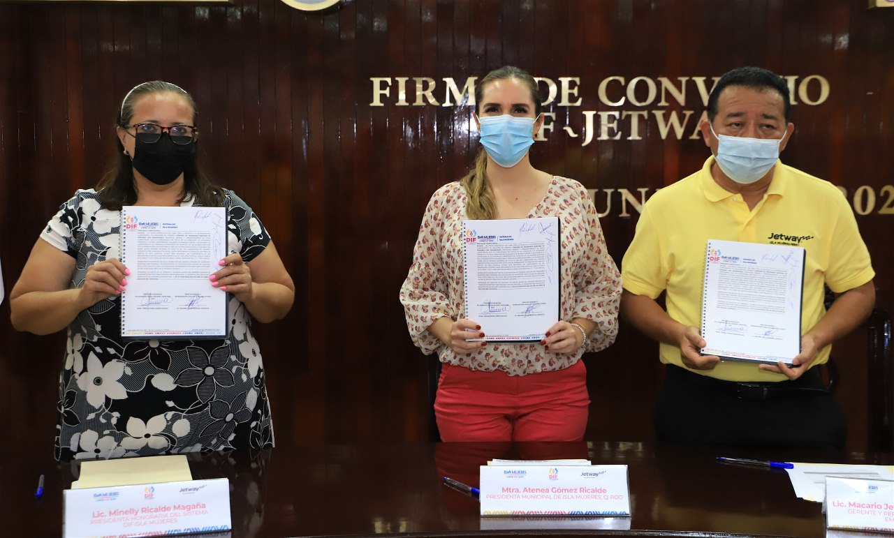 En la firma de convenio estuvieron presentes la presidenta honoraria del DIF Municipal, Minelly Ricalde Magaña; el director operativo de Jetway Puerto Juárez, José de Jesús López Novelo; el gerente de Jetway, Macario Jesús Encalada González y el director del Sistema DIF Municipal, Jacinto Ríos Nájera.