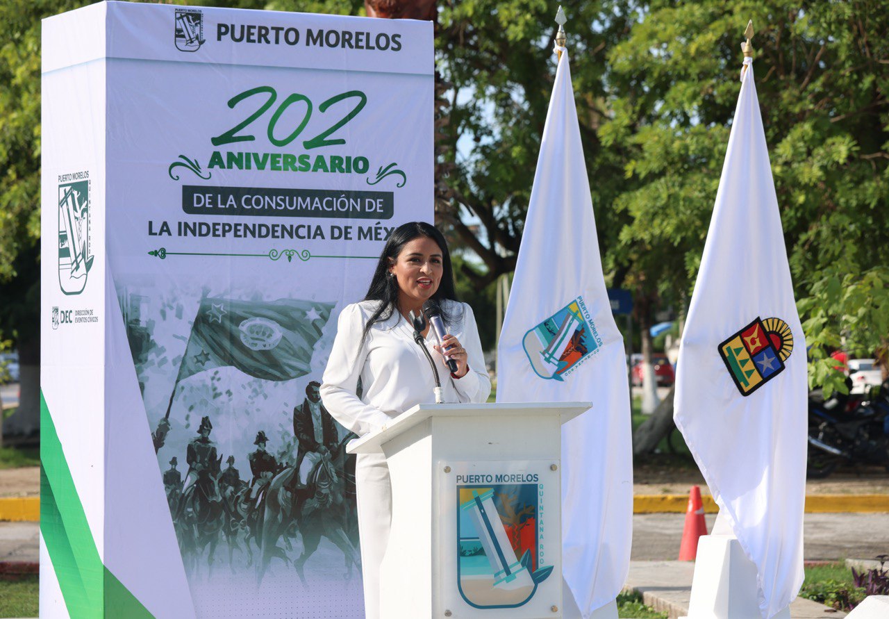 Puerto Morelos, Quintana Roo.- La presidenta municipal Blanca Merari Tziu Muñoz encabezó hoy la ceremonia cívica con motivo del 202 aniversario de la Consumación de la Independencia de México, marco en el que destacó que con este evento se recuerda una de las principales responsabilidades que tenemos como mexicanos: luchar por la libertad de nuestro pueblo, en todo momento, y por difíciles que sean las circunstancias.