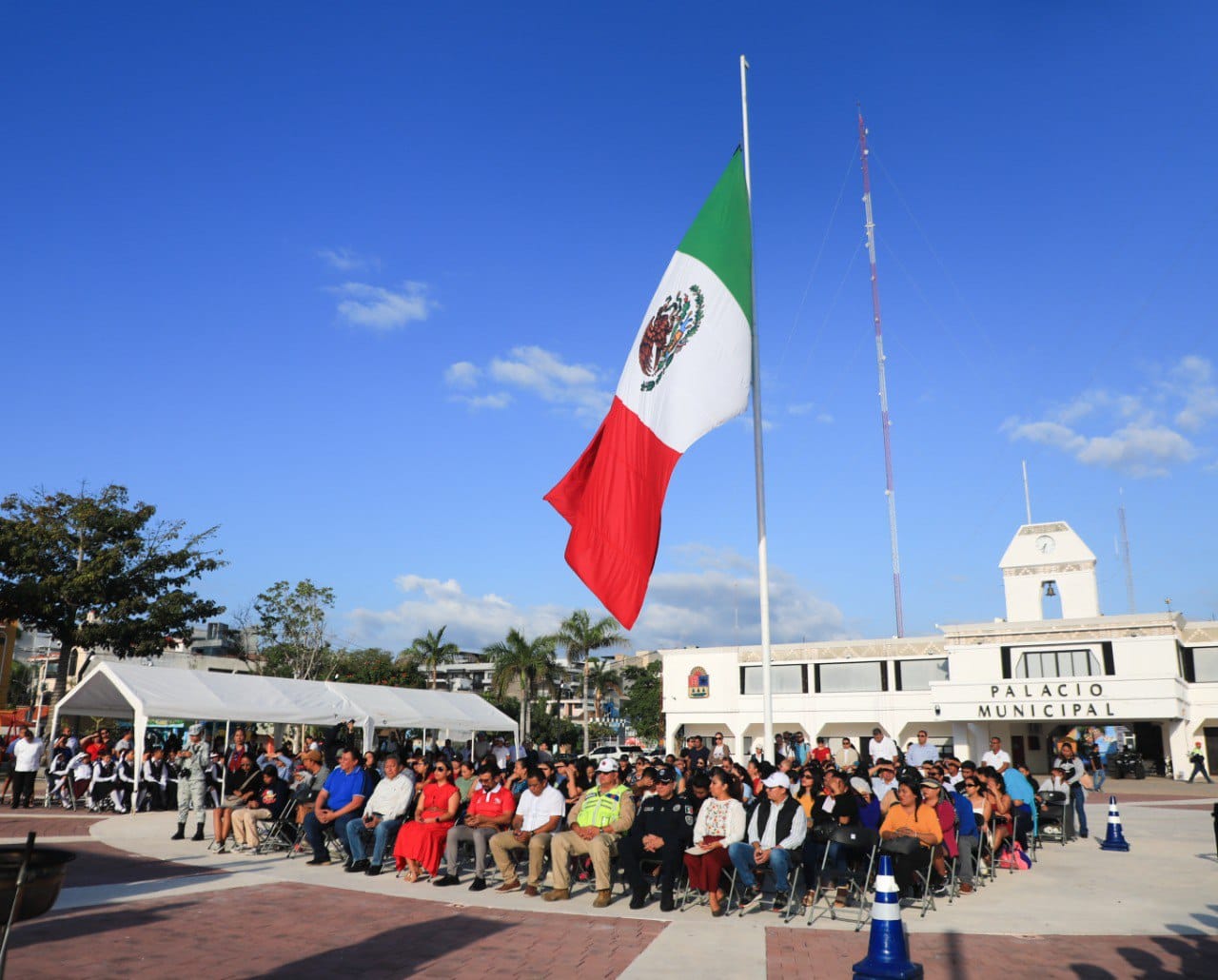 PLAYA DEL CARMEN- Con la participación de más de 21 escuelas de diversos niveles educativos, se llevó a cabo en la renovada Plaza 28 de Julio, la exhibición de escoltas y de bandas de guerra en conmemoración del Día de la Bandera, evento que fue encabezado por la presidenta municipal Lili Campos.