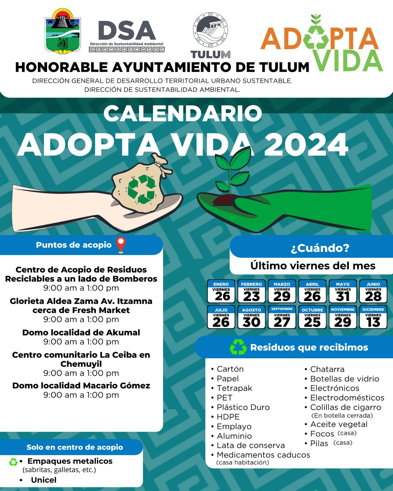 La campaña “Adopta Vida” está dirigida a los hogares con el objetivo de fomentar prácticas ambientales responsables desde el propio hogar. La participación incluye la adopción de una planta, promoviendo así la reforestación y el cuidado del medio ambiente desde la comodidad del hogar. Además, se proporcionan charlas informativas sobre la gestión adecuada de los residuos, abordando temas como los Permisos de Operación Ambiental emitidos por la DSA, así como las leyes y acciones que los negocios deben cumplir en el municipio de Tulum. Este enfoque educativo también abarca el manejo adecuado de los residuos.