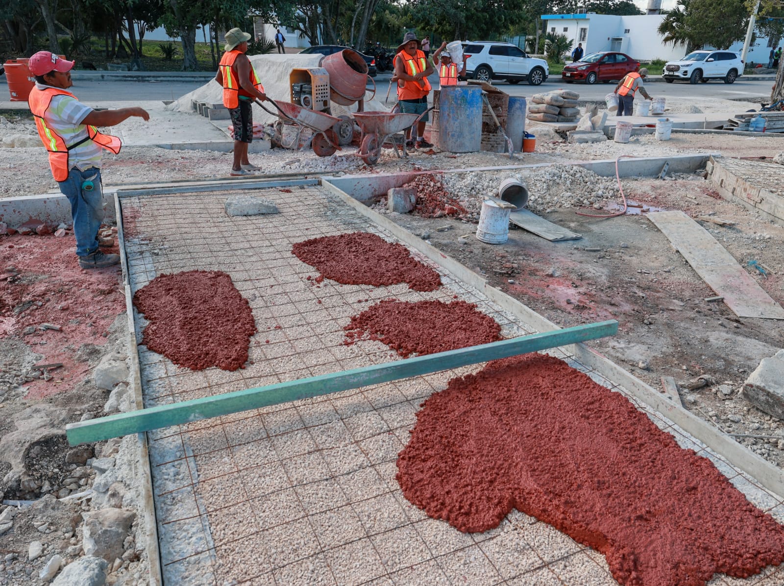 Isla Mujeres.-El Gobierno que encabeza la alcaldesa Atenea Gómez Ricalde, continúa cumpliendo compromisos con la gente de la Zona Continental y haciendo obras que les generen un mayor bienestar y desarrollo, como es el caso de la Plaza Ejidatarios de Ciudad Mujeres, la cual registra un avance del 40 por ciento.