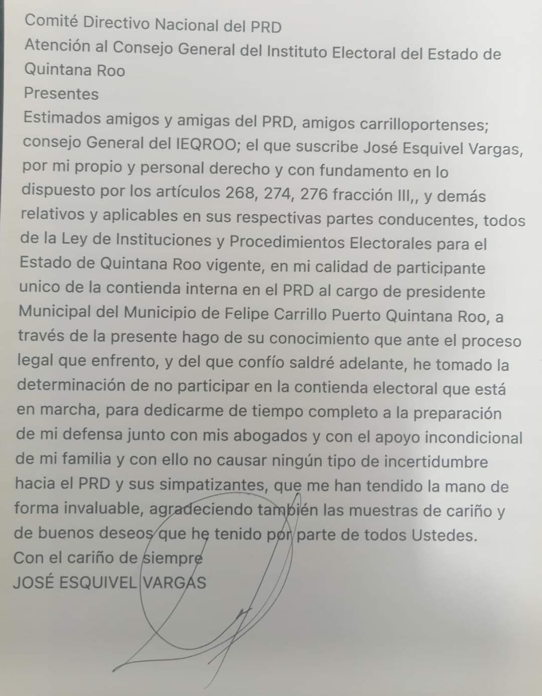 Poco después, el exalcalde, mediante una carta publicada en sus redes sociales, anunció no contenderá por la presidencia municipal, para enfocarse en el proceso penal que lo mantuvo privado de la libertad desde el martes pasado.