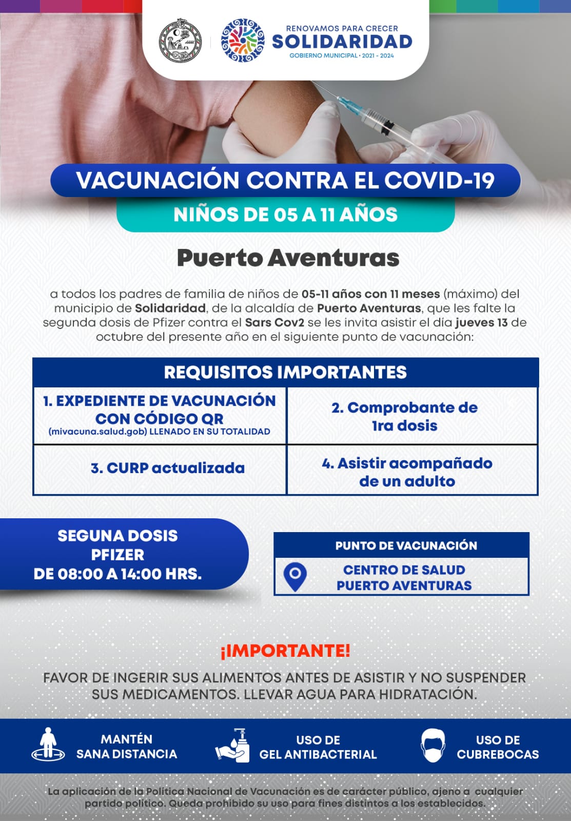 playa del carmen. Ayer y hoy se aplicará la segunda dosis de vacunas contra el Covid-19, como parte del trabajo conjunto del gobierno de Lili Campos con los tres órdenes de gobierno, que tiene como fin salvaguardar la salud de la infancia solidarense. Serán dos mil dosis del biológico de la marca Pfizer.