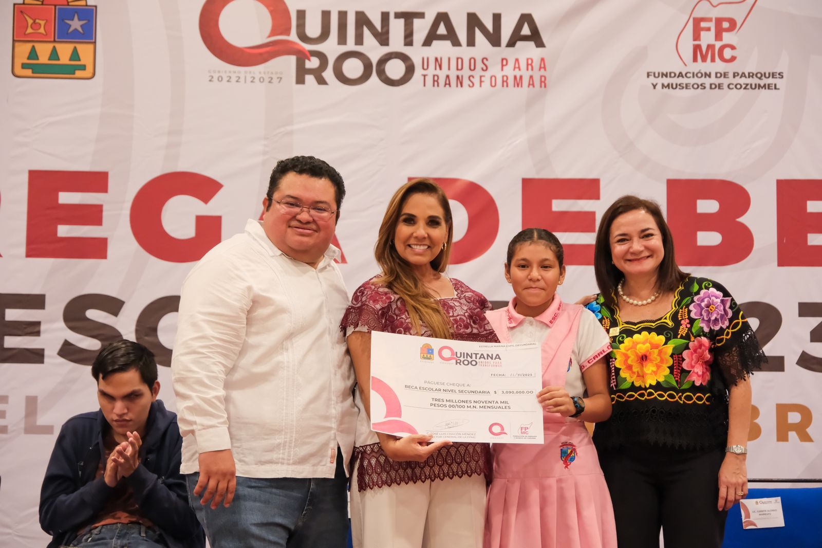Estuvieron en esta entrega de becas el diputado federal Juan Carrillo Soberanis, el diputado local Renán Sánchez, Edgar Reyes Loría, representante de la SEQ, y los beneficiarios Gael Alejandro Peña Góngora, Estrella Marina Cupul y Sandy Estrella
