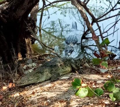 Posteriormente se recibió nuevamente el reporte y al arribar al lugar se observan a dos cocodrilos en la orilla de la laguna, junto a los huevos que estaban en el nido.