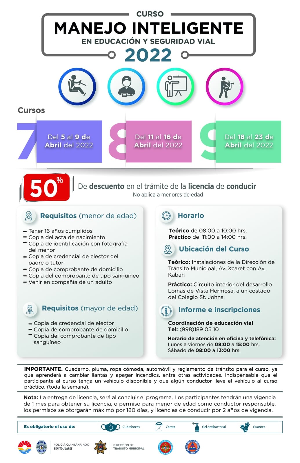 Es importante señalar que el cupo es limitado y tiene un costo de recuperación, por lo que se ofrece un descuento del 50 por ciento al momento de tramitar la licencia o el permiso de conducir, al concluir el curso; por lo que los interesados en tomar el curso pueden inscribirse en la Coordinación de Educación Vial de la Dirección de Tránsito, en horario de oficina de 8:00 a 15:00 horas, o comunicarse al número telefónico 998-189-0510.