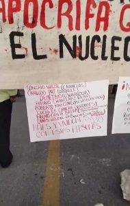 Entre las pancartas y mantas que ostentan los manifestantes se encuentran una con la leyenda “Ejidatrios del ejido Xmaben exigimos la intervención del Tribunal Agrario Nacional que impugne un acta apócrifo que nunca llevó a cabo en el núcleo ejidal”.