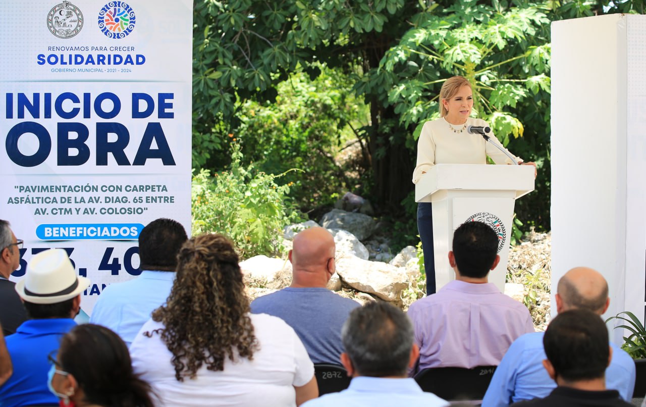 La presidenta municipal afirmó: “nuestro compromiso es servir y trabajar escuchando a las y los solidarenses, quienes piden que generemos vías alternas, como esta avenida Diagonal 65, que servirá de desahogo del cruzamiento de la Av. 28 de Julio con bulevar Playa Del Carmen. Además, será una arteria con diseño amigable con el medio ambiente, preservando el cenote e incluyéndolo como parte del paisaje urbano”.