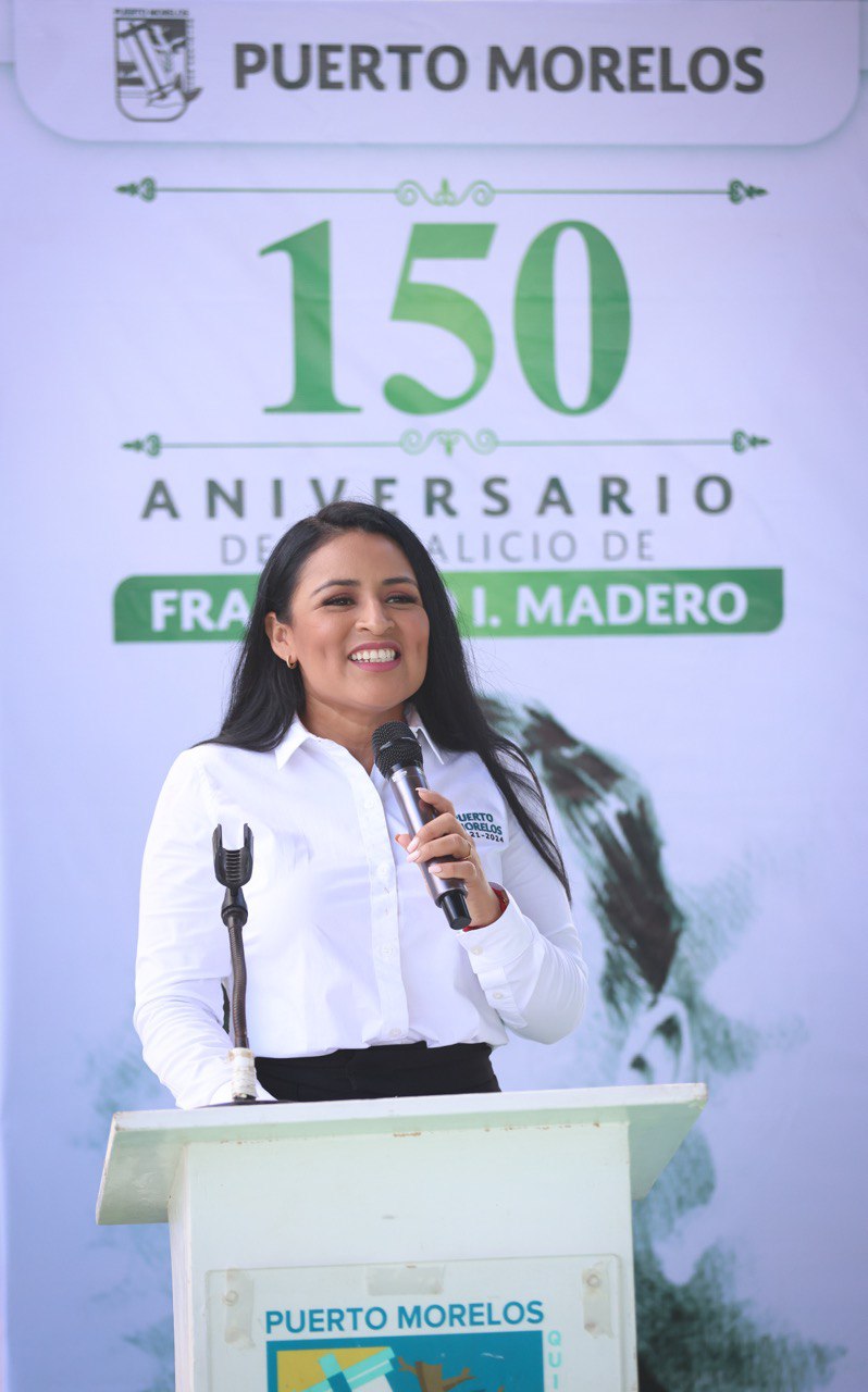 PUERTO MORELOS.— Como parte del programa Ayuntamiento en tu Escuela, la presidenta municipal Blanca Merari Tziu Muñoz encabezó esta mañana la ceremonia cívica con motivo del 150 aniversario del natalicio de Francisco I Madero en el Jardín de Niños que lleva el nombre del prócer en esta cabecera municipal.