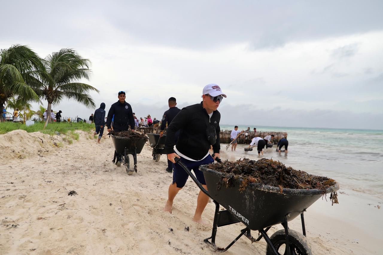 El operativo especial de recolección de sargazo está a cargo del personal adscrito a la Zona Federal Marítimo Terrestre (Zofemat) de Isla Mujeres, quienes con el apoyo de la ciudadanía, voluntarios, personal del Ayuntamiento, pescadores y comerciantes, a partir de las 6 de la mañana y hasta las 5 de la tarde trabajan incansablemente para mantener limpia la emblemática Playa Norte.