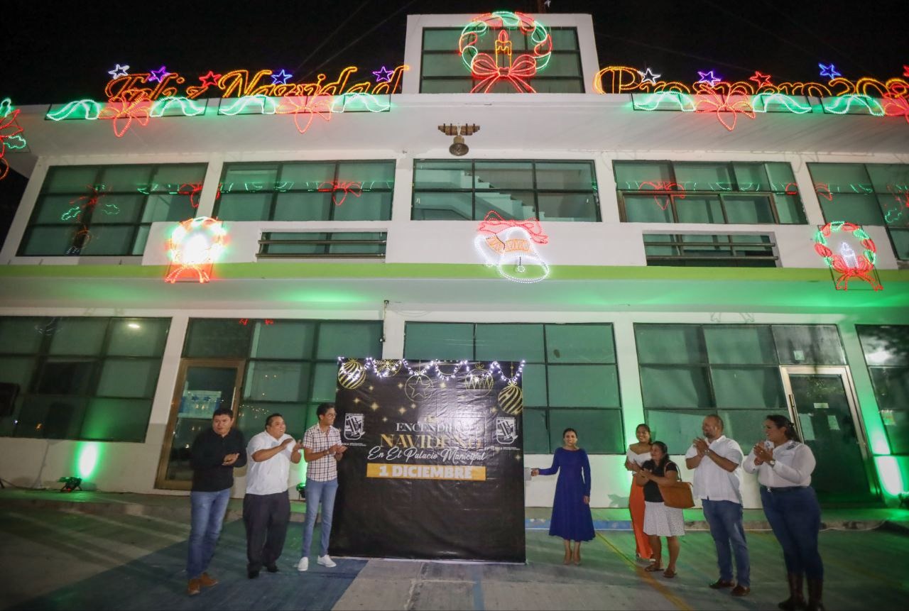 Puerto Morelos.- La presidenta municipal Blanca Merari Tziu Muñoz cumplió una tradición al encender anoche la iluminación navideña en el Palacio Municipal.