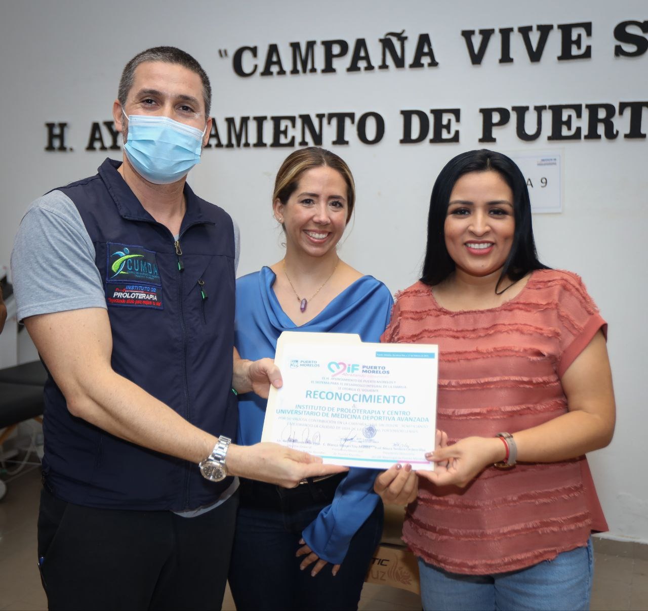 Puerto Morelos- La presidenta municipal Blanca Merari Tziu Muñoz entregó hoy reconocimientos a los representantes de las instituciones que se sumaron a la campaña “Vive sin dolor”, que se puso en marcha el lunes pasado en beneficio de más de 300 habitantes de la comunidad que padecen dolores crónicos, deportistas con lesiones, adultos mayores y quienes por accidentes requieren de rehabilitación, a través de tratamientos de proloterapia.