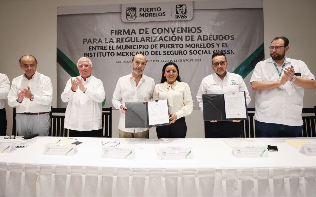 Puerto Morelos, Quintana Roo.— El gobierno de la alcaldesa Blanca Merari Tziu Muñoz y el Instituto Mexicano del Seguro Social (IMSS) firmaron hoy dos convenios, con los que se liquidarán 80 millones 716 mil pesos correspondientes a adeudos heredados de la anterior administración municipal, que descontó a los trabajadores del Ayuntamiento sus cuotas obrero-patronales en 2020 y 2021 pero omitió el pago correspondiente a la institución.