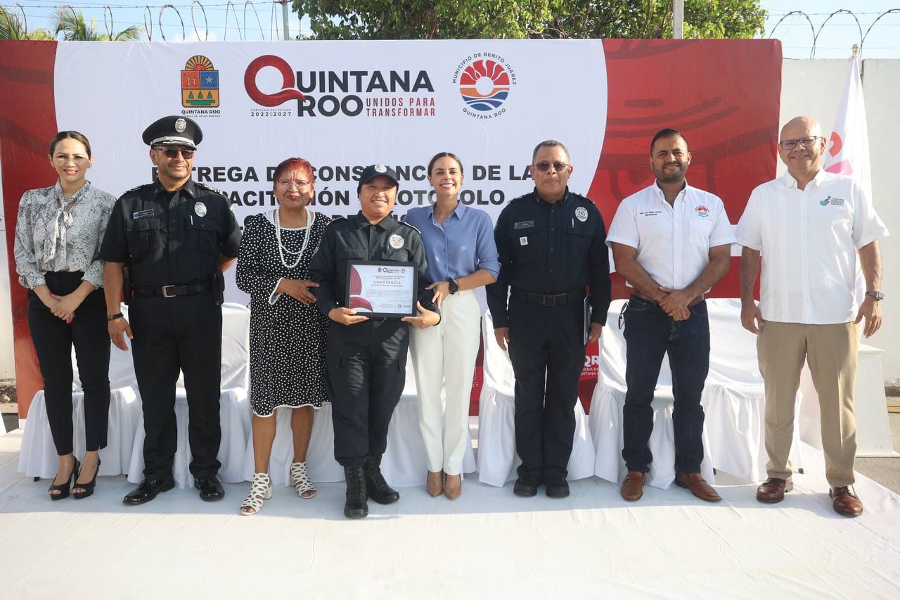 Ana Paty Peralta agradeció a cada uno de los elementos por su compromiso, por llevar el uniforme bien puesto, ayudar a construir una mejor versión de Cancún, con justicia, paz y armonía; una ciudad donde las niñas, niños, jóvenes y adultos, se sientan seguros, “confío que aplicarán todo lo aprendido en este curso para mejorar su servicio, para ayudarnos a que el respeto a los derechos humanos sea una realidad para todas y todos”, dijo.