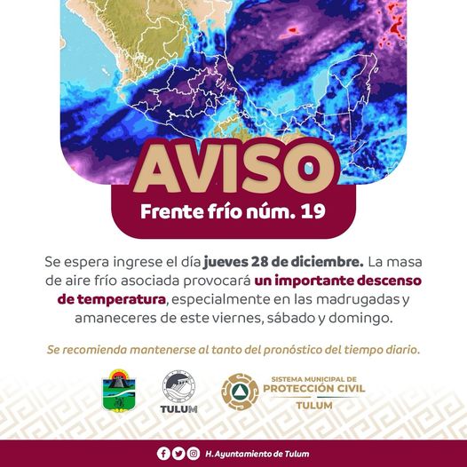 TULUM.- Autoridades de Protección civil emitieron un comunicado para informar a la ciudadanía sobre la entrada del Frente Frío 19 a Tulum, el cual traerá un descenso importante de temperatura y se espera tenga influencia en los últimos días de este año.