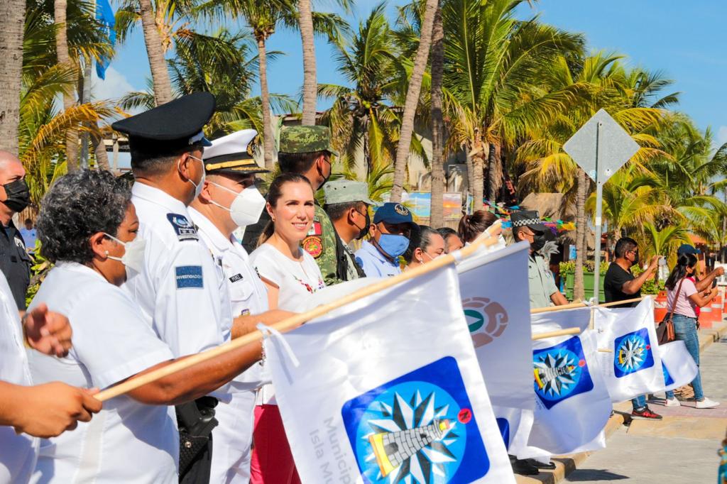 ISLA MUJERES. -Acompañada de los tres órdenes de gobierno, la presidenta municipal de Isla Mujeres, Atenea Gómez Ricalde, dio el Banderazo del Operativo Verano Seguro 2022 en Playa Centro con la finalidad de garantizar una estancia segura tanto a locales como a los cerca de 30 mil turistas diarios que llegarán en los próximos días a la isla.