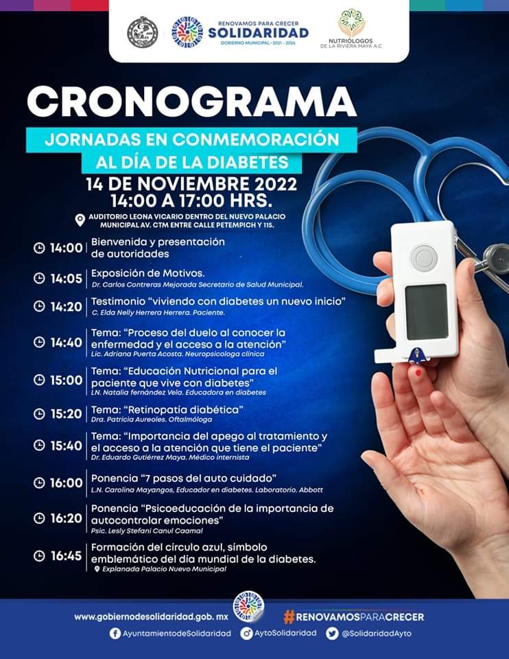 Playa del Carmen.- A fin de promover la educación en diabetes, la presidenta Lili Campos invita a participar en las jornadas conmemorativas al Día de la Diabetes, donde se llevará a cabo el “Foro Aprendamos sobre Diabetes” para concientizar sobre el cuidado de la salud y las familias solidarenses gocen de una buena calidad de vida.