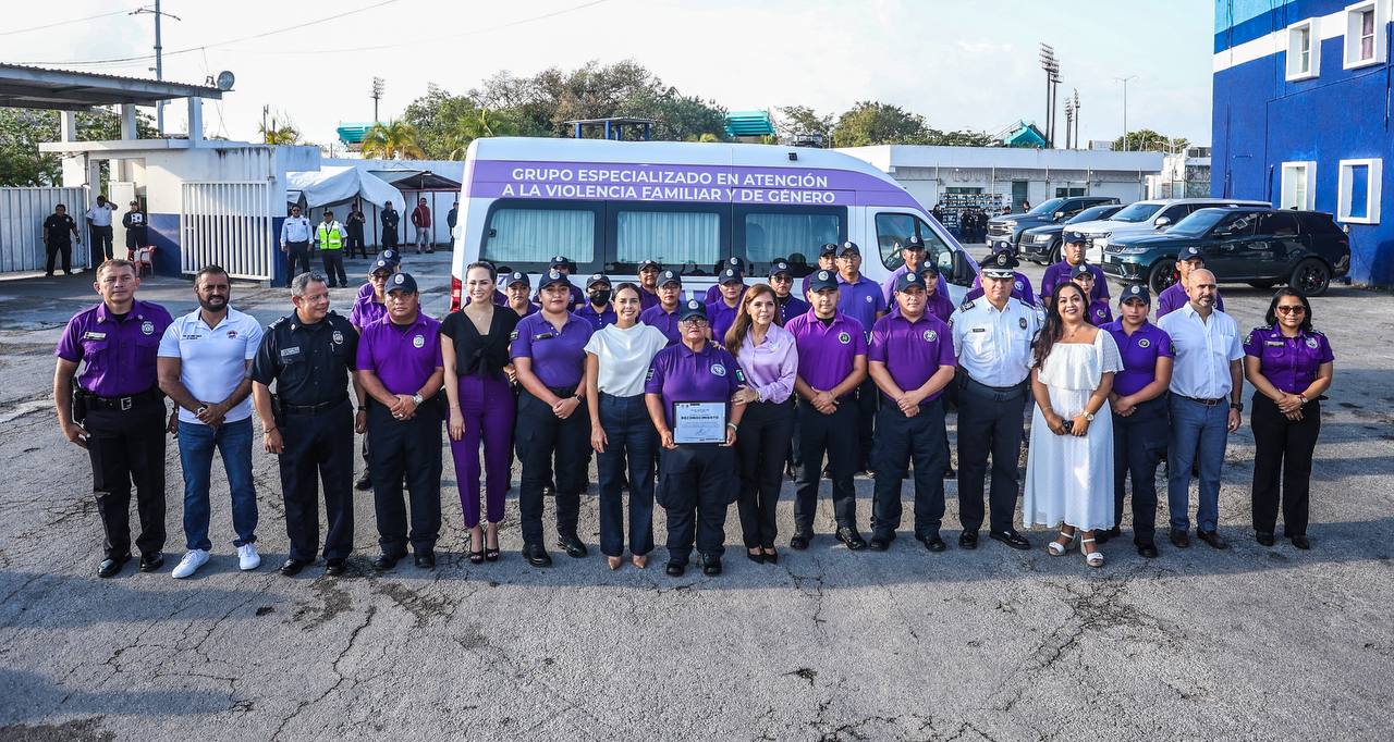 Cancún.- “Con esta entrega de uniformes al personal del Grupo Especializado en Atención a la Violencia Familiar y de Género (GEAVIG), equipamos a nuestras mujeres y hombres que cumplen con una función sumamente importante de atender a las víctimas de estos hechos y a quienes enaltecen nuestra institución por su compromiso de servir, salvaguardar y velar por la seguridad de las y los cancunenses y muy en especial de nuestras niñas, niños, adolescentes y mujeres”, expresó la Presidenta Municipal, Ana Paty Peralta, al reconocer su labor y otorgar la indumentaria completa para 36 elementos de dicha agrupación policiaca.