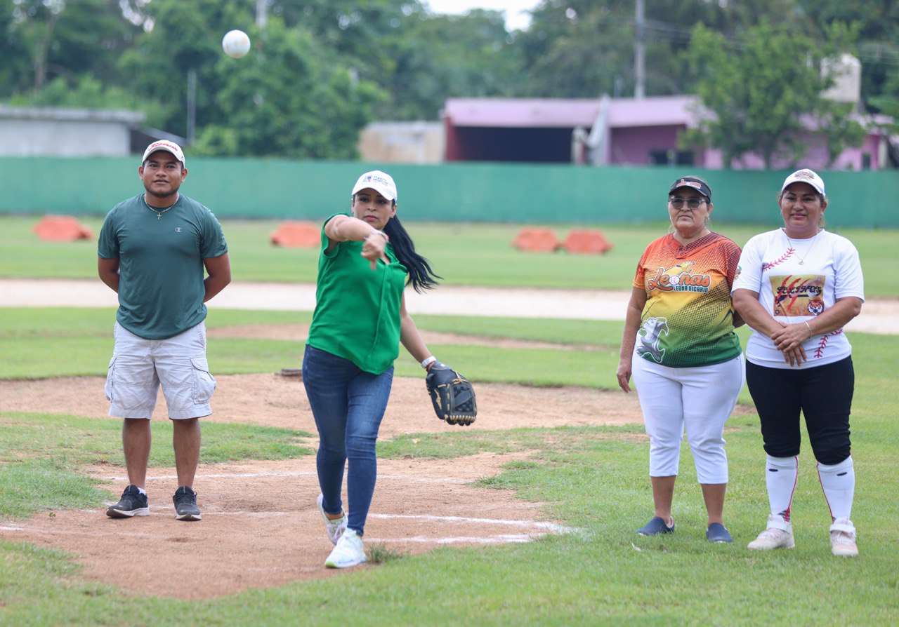 Leona Vicario.- La presidenta municipal Blanca Merari Tziu Muñoz lanzó hoy la primera bola del cuadrangular de softbol femenil con causa, que se llevó a cabo en el campo municipal de beisbol de esta comunidad.