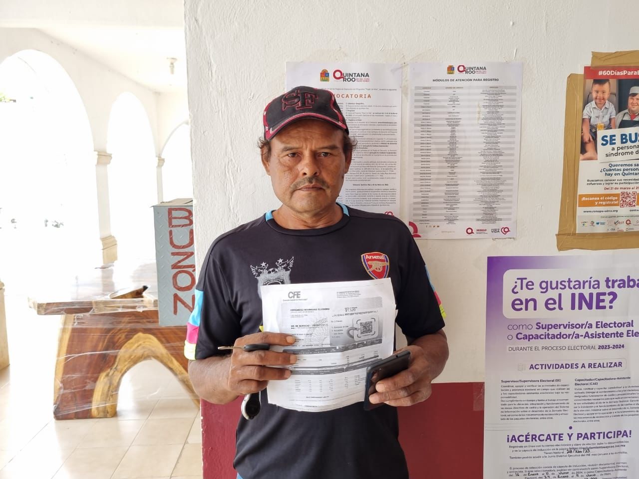 JOSÉ MARÍA MORELOS.- Un campesino de la comunidad de López Mateos denunció el cobro excesivo de su recibo de luz, el cual le llegó con un monto a pagar de 152 mil 59 pesos, por este motivo pide ayuda para demandar a la Comisión Federal de Electricidad (CFE).
