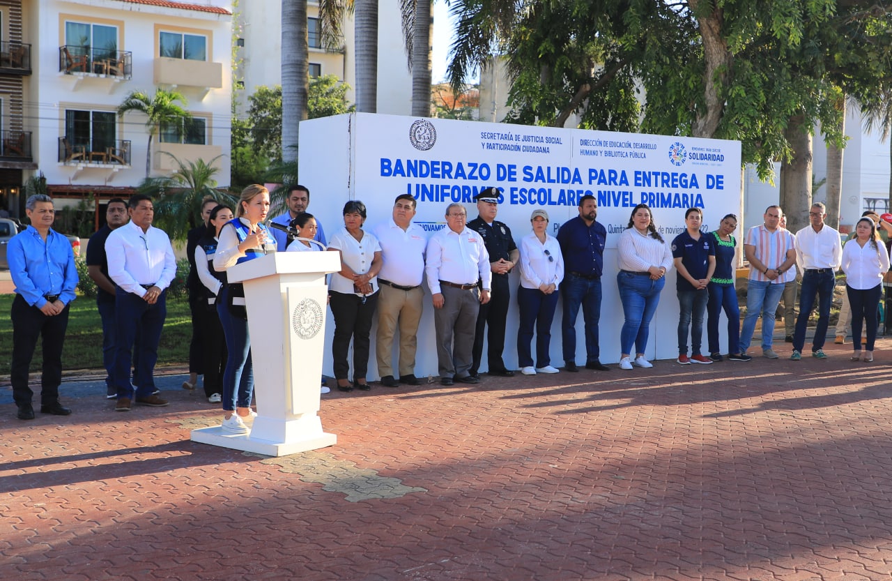 Playa del Carmen, Solidaridad.- La presidenta Lili Campos dio el banderazo para entregar 33 mil kits de uniformes escolares gratuitos a niñas y niños de 89 planteles de nivel primaria de todo el municipio, en los que se invirtieron 22 millones de pesos.