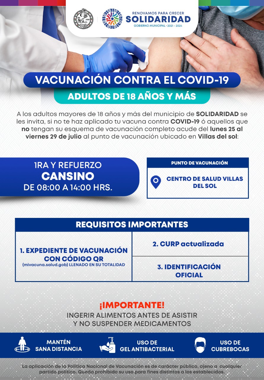 Playa del Carmen, Solidaridad.- El gobierno municipal de Solidaridad, encabezado por Lili Campos, invita a los adultos de 18 años y más del municipio a participar en la jornada de vacunación contra la covid-19 del lunes 25 al viernes 29 de julio, en el Centro de Salud de Villas del Sol