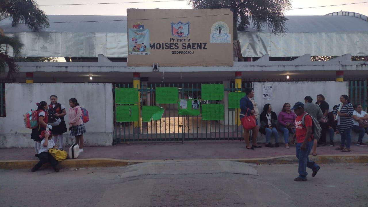 FELIPE CARRILLO PUERTO.- Padres de familia toman la escuela primaria Moisés Sáenz de Felipe Carrillo Puerto, debido a que las autoridades educativas no han resuelto el problema por la falta de un maestro de base para atender a sus hijos del primer grado.