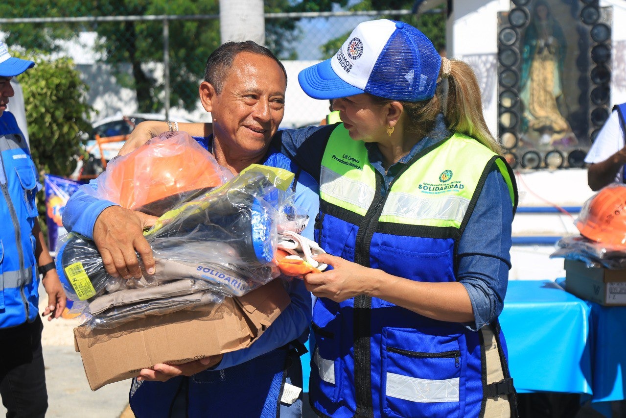 PLAYA DEL CARMEN. – La presidenta Lili Campos y el secretario Benny Millán entregaron uniformes para 55 colaboradores de las direcciones de Alumbrado Público y Normatividad y Saneamiento Ambiental, con el objetivo de hacer eficiente y garantizar su seguridad al momento de realizar su labor.
