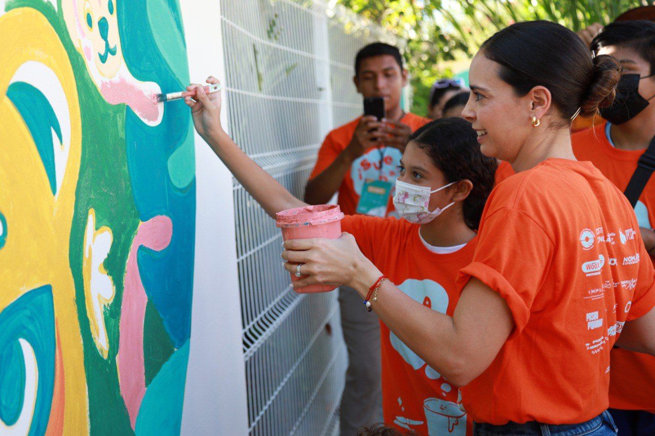 Acompañada de sus hijos y junto con niños, adolescentes y padres de familia, la Primera Autoridad Municipal pintó una parte de los murales que se diseñaron para la calle He-Zaba, en el exterior del Centro de Atención Múltiple (CAM) “Eduardo Huet”, los cuales consistieron en tres corazones con fauna y flora nativa de Cancún.