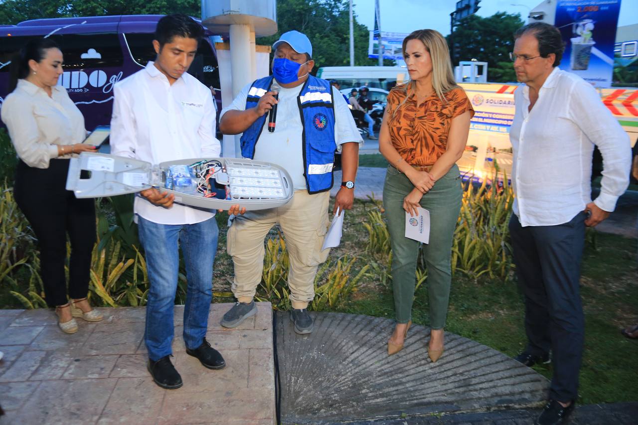 Playa del Carmen, Solidaridad.- Con la instalación de la luminaria número dos mil, frente a conocida plaza comercial, la presidenta municipal Lili Campos, constató el arranque de los trabajos del proyecto de modernización de 42 cruceros seguros.
