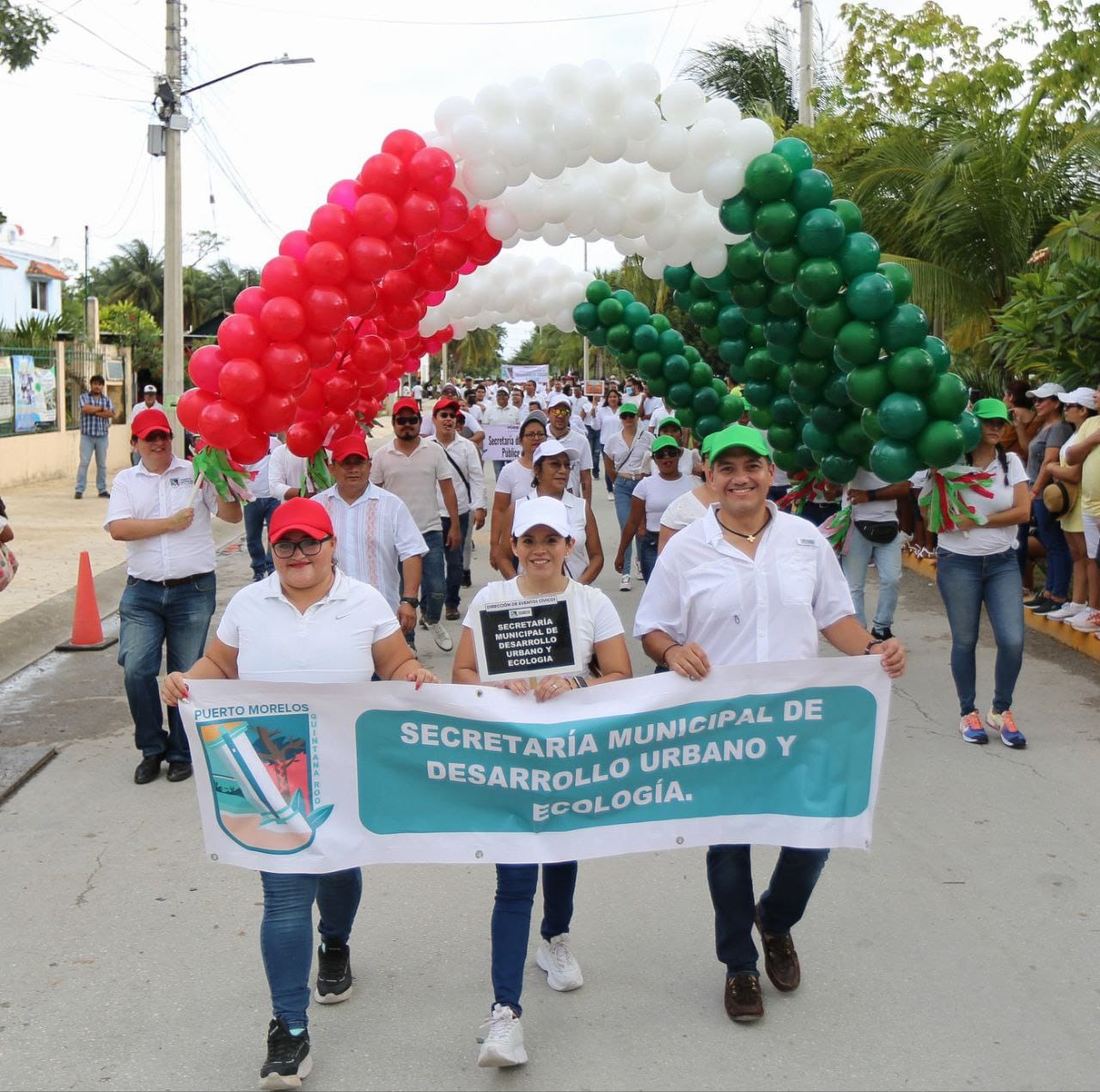 Desfilaron contingentes de estudiantes de preescolar, primaria, secundaria y nivel medio superior, además de personal de todas las áreas de la Administración Pública Municipal. También integrantes de la Cuadra la Jungla de Puerto Morelos, que ha representado al municipio en carreras de barriles a caballo.