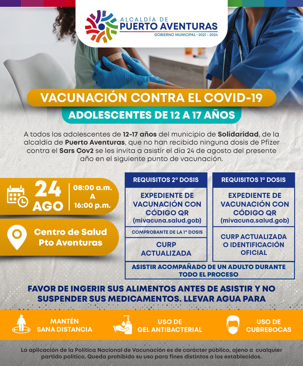 Asimismo, destacó que el miércoles 24 de agosto se aplicarán las primeras y segundas dosis para adolescentes de 12 a 17 años también para Puerto Aventuras.
