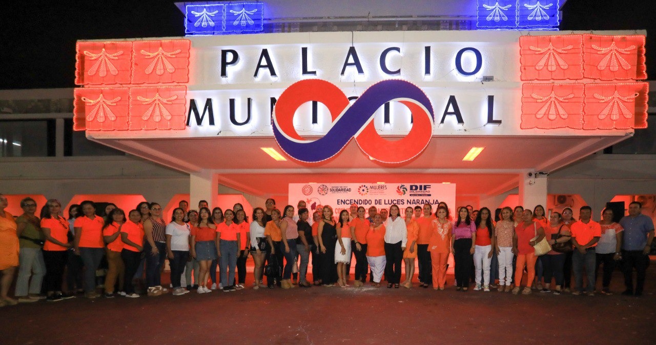 Playa del Carmen.- Como parte de las acciones de sensibilización que impulsa la presidenta Lili Campos en la lucha para erradicar la violencia contra las mujeres, se iluminó de color naranja el edificio del antiguo palacio municipal, en coordinación con el Instituto de la Mujer.