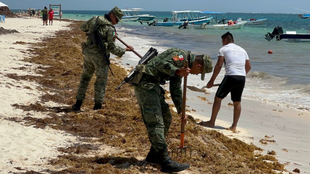 Por un lado puede observarse a elementos de la Secretaría de Marina (Semar) que realizan trabajo de limpieza a orilla de la playa, así como dos embarcaciones menores de esta dependencia utilizadas para la recolecta del alga entes que llegue a la costa.