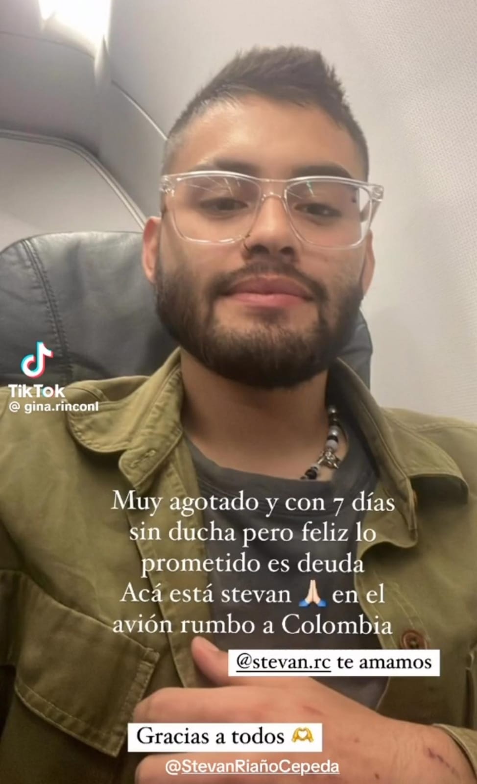 “Muy agotado y con 7 días sin ducha pero feliz lo prometido es deuda Acá está stevan en el avión a Colombia” (sic), se lee en la publicación de TikTok, donde también se compartió una fotografía del joven.