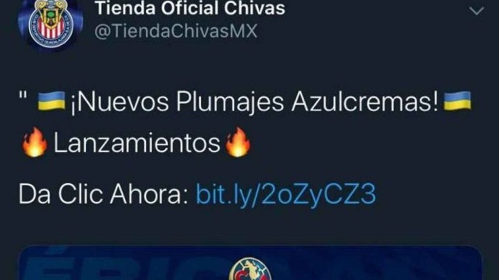 Ciudad de México.- La tienda oficial de Chivas, a través de su cuenta de Twitter, promovió la nueva ropa del América, situación que desencadenó en varios comentarios hacia el perfil de los rojiblancos, algunos de ellos fueron en tono de burla.